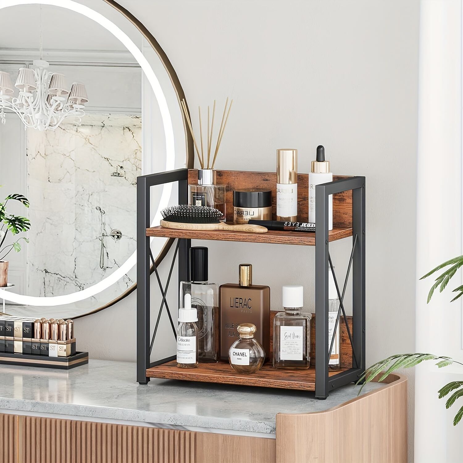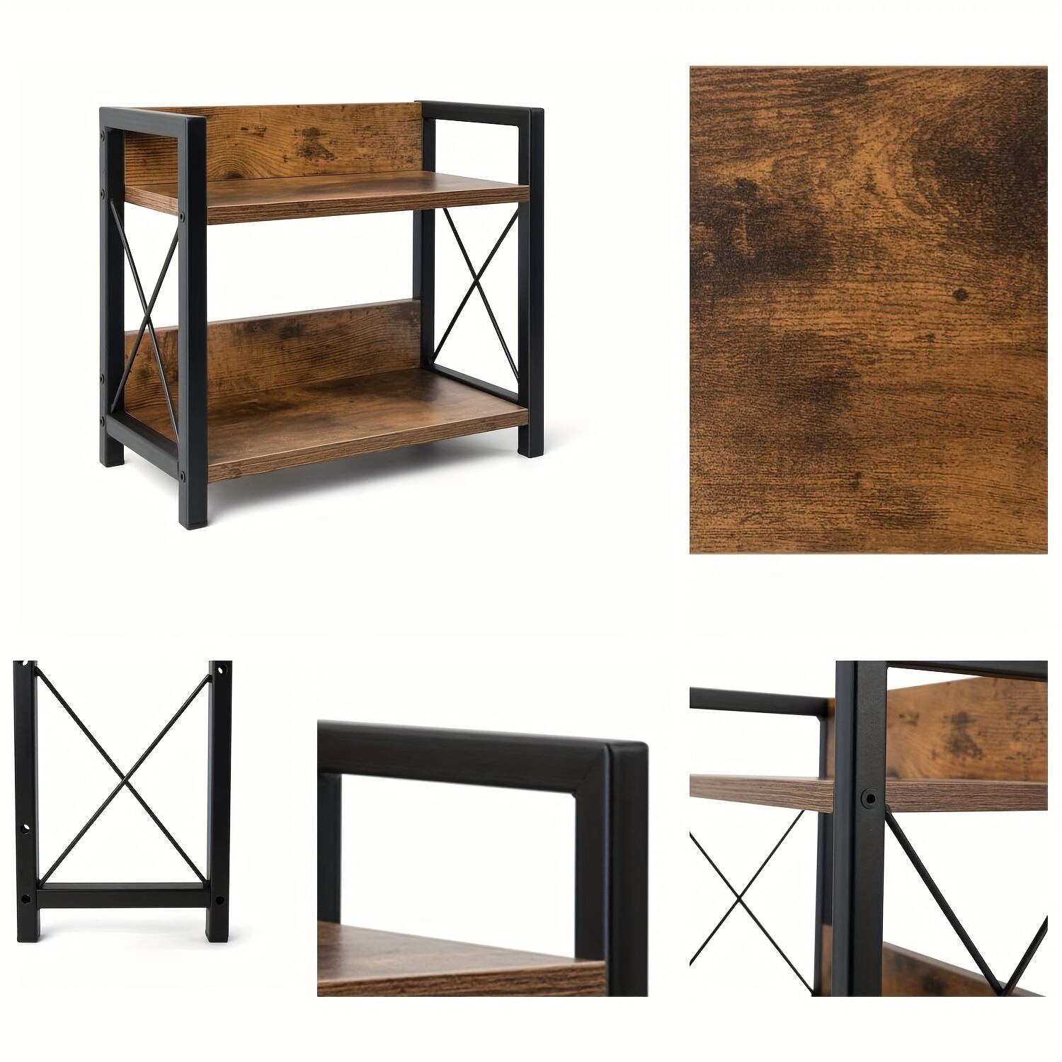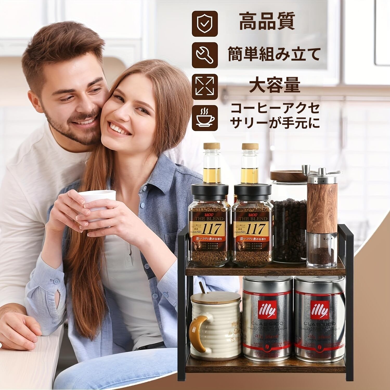段木製コーヒーバー&スパイスラックオーガナイザー - キッチンカウンター用エレガントなブラックメタルフレームと天然木棚 | コーヒー、紅茶、調味料、マグカップ&カップ用の省スペース収納、スタンディングシェルフ